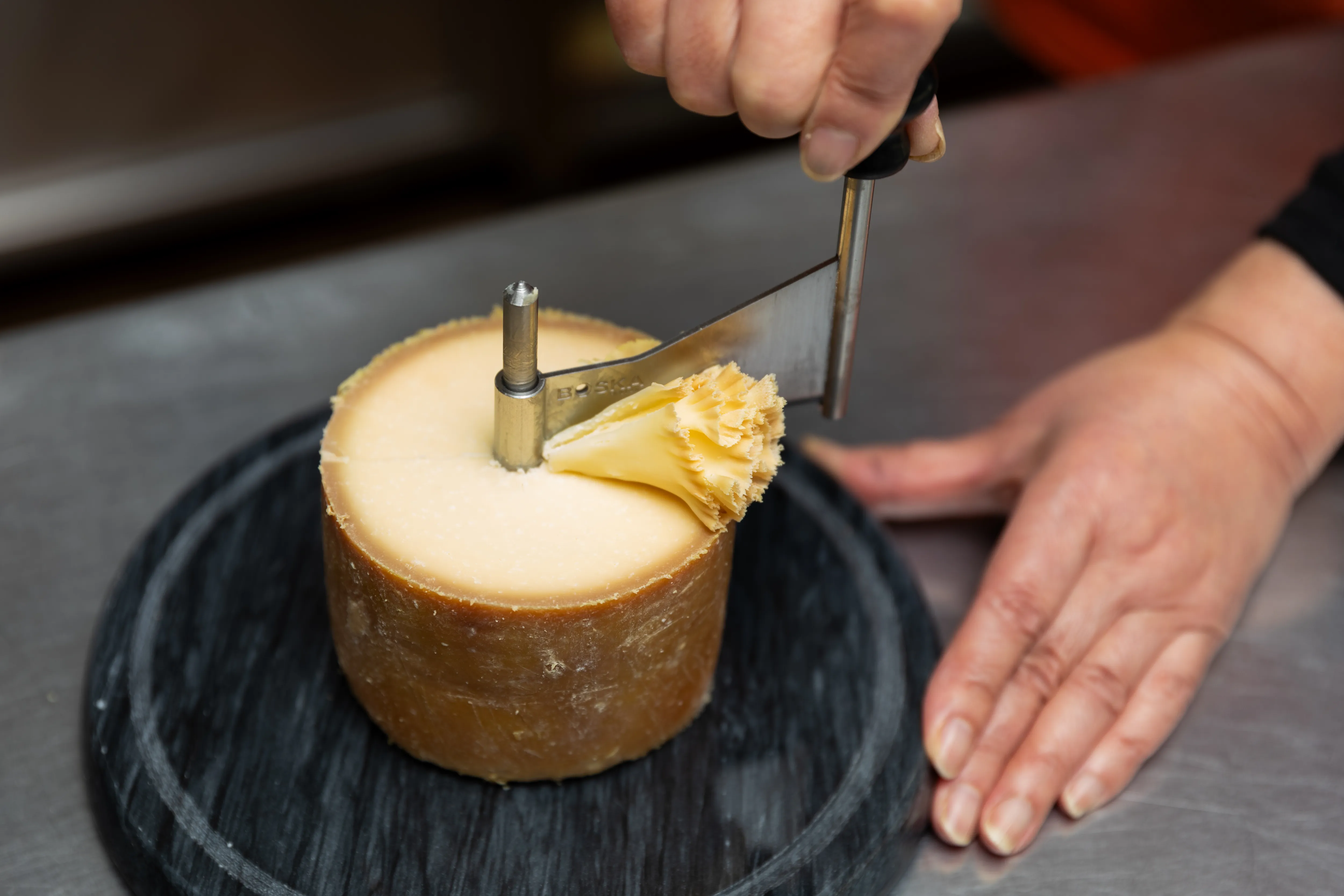 お客様の様々なご要望にお応えするため、私たちは自社でチーズをカットしています。 数グラム単位の少量から、数キロ単位の大きな塊まで、ご希望の量でご提供が可能です。