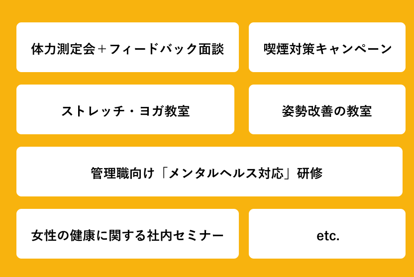 自社で健康イベントや研修を企画・運営し、従業員が自ら健康な行動を始めるための「仕掛け」として設計します。実施後のアンケート分析や改善提案まで一貫してサポートすることで、会社の成長を後押しします。
