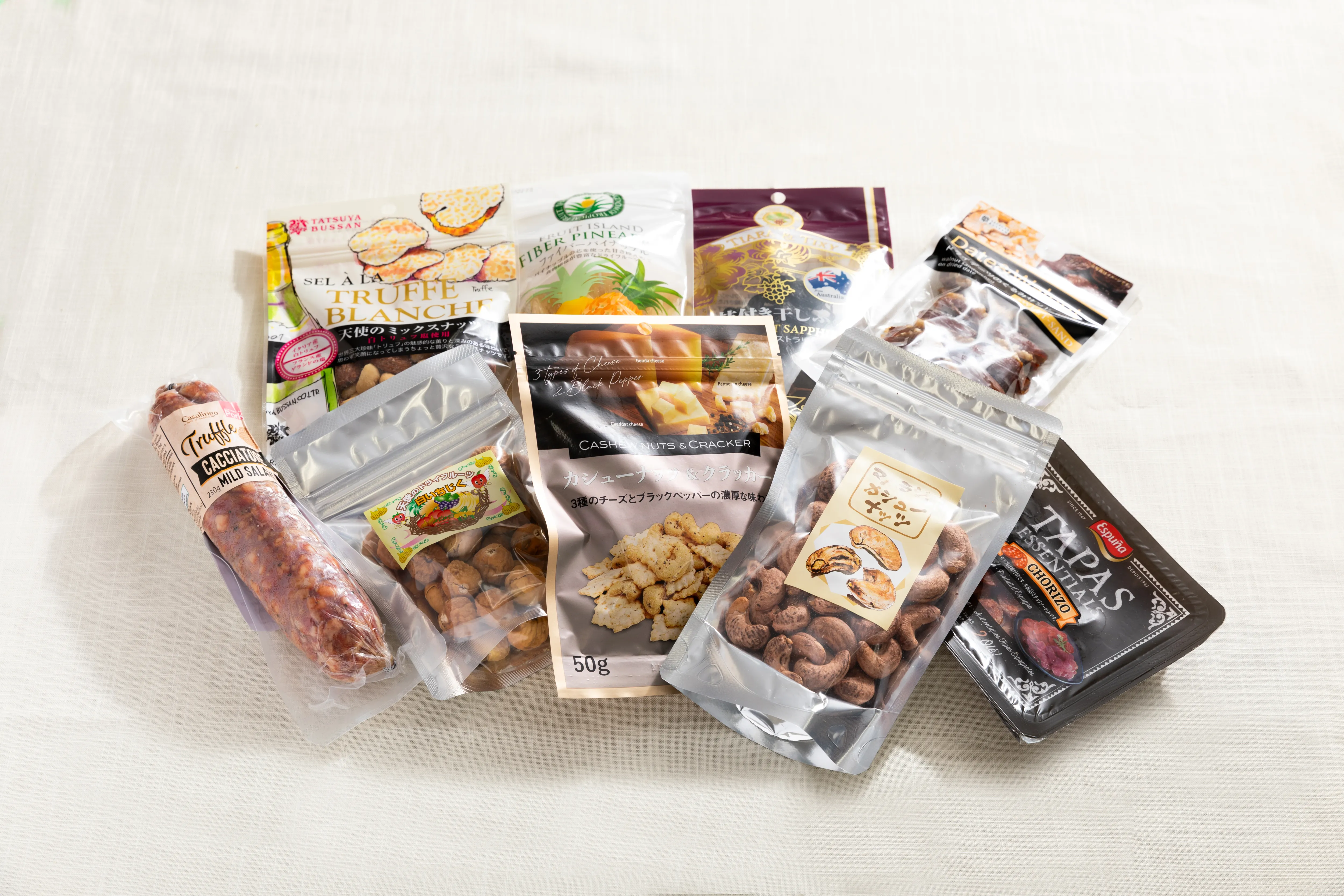 サラミやナッツ、クラッカー、ドライフルーツも取り扱っています。すべて試食して「美味しい」と思ったものだけを販売しています。基準は、ワインとチーズに合うかどうかです。一緒に食べた時にワインやチーズの美味しさをより引き出してくれる、そんなおつまみを揃えています。